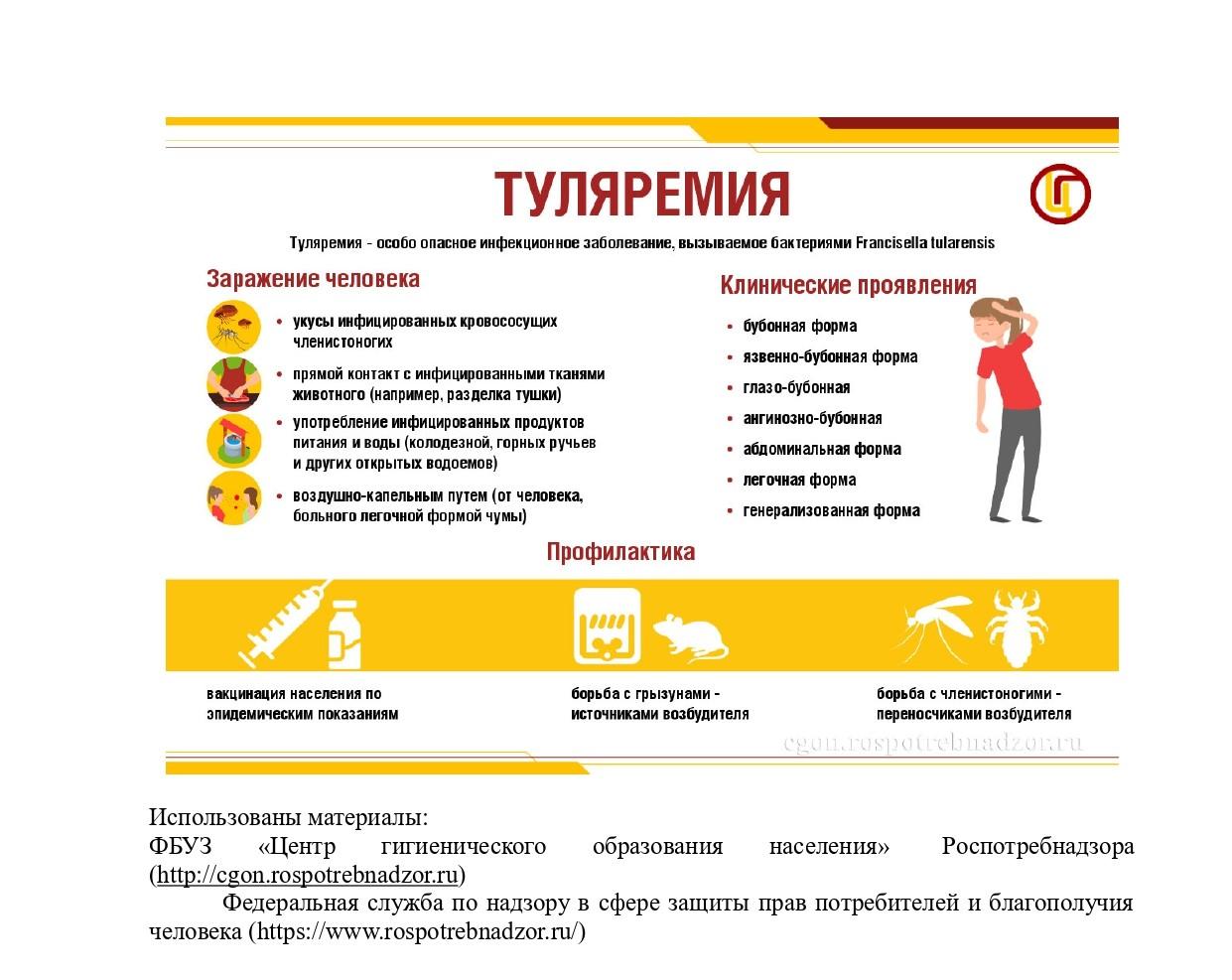 Информация для населения о туляримии Сайт Федеральной службы по надзору в сфере защиты прав потребителей и благополучия человекаСайт ФБУЗ "Центр гигиенического образования населения" Роспотребнадзора