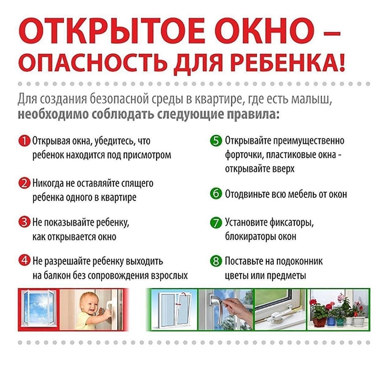 1. Большинство случаев падения происходит тогда, когда родители оставляют детей без присмотра. Не оставляйте маленьких детей одних. 2. Отодвиньте от окон все виды мебели, чтобы ребенок не мог залезть на подоконник. 3. Никогда не рассчитывайте на москитные сетки! Они не предназначены для защиты от падений! Напротив — москитная сетка способствует трагедии, ибо ребенок чувствует себя за ней в безопасности и опирается как на окно, так и на нее. Очень часто дети выпадают вместе с этими сетками. 4. По возможности, открывайте окна сверху, а не снизу. 5. Ставьте на окна специальные фиксаторы, которые не позволяют ребенку открыть окно более чем на несколько дюймов. 6. Защитите окна, вставив оконные решетки. Решетки защитят детей от падения из открытых окон. 7. Если вы что-то показываете ребенку из окна — всегда крепко фиксируйте его, будьте готовы к резким движениям малыша, держите ладони сухими, не держите ребенка за одежду. 8. Если у вас нет возможности прямо сейчас установить фиксирующее и страховое оборудование, вы легко можете просто открутить отверткой болты, крепящие рукоятки и убрать их повыше, используя по мере необходимости и сразу вынимая после использования. БЕРЕГИТЕ ДЕТЕЙ!